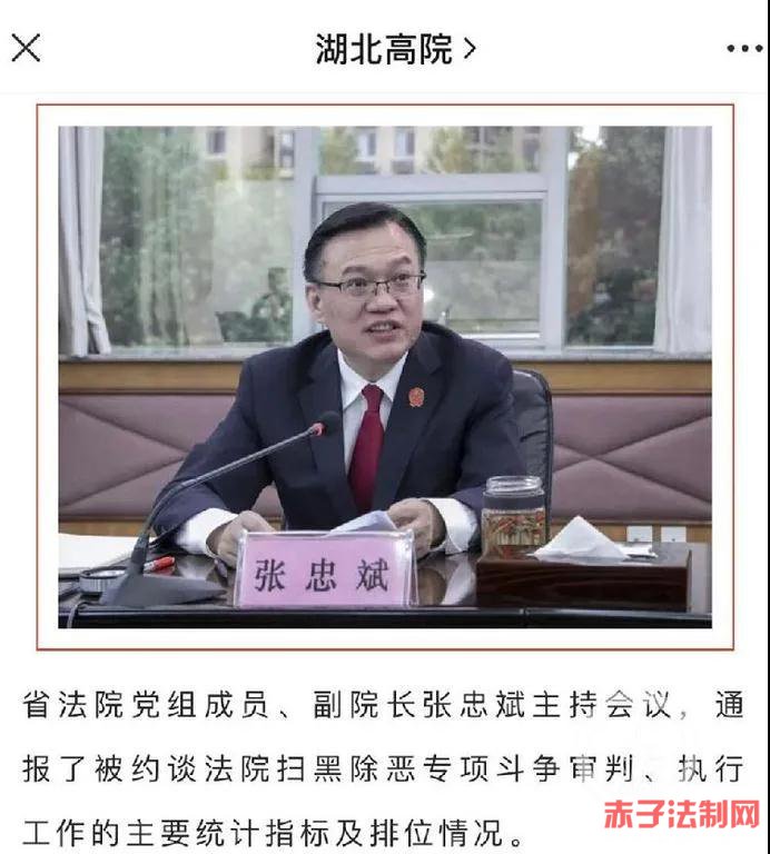 湖北省高院微信公号显示,10月16日下午,省法院召开推进扫黑除恶专项斗争审判执行工作约谈会,对9月底以前受理涉黑涉恶案件存量较多和“黑财”执行到位率较低的7个中院主要领导进行集体约谈。省法院党组成员、副院长张忠斌主持会议,通报了被约谈法院扫黑除恶专项斗争审判、执行工作的主要统计指标及排位情况。