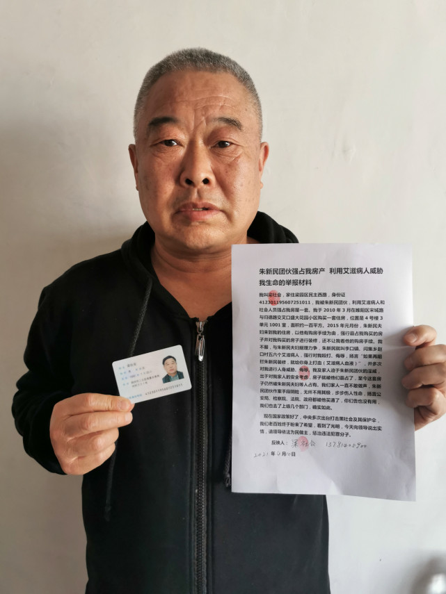 我于2010年3月在睢阳区宋城路与归德路交叉口盛大花园小区购买一套住房,位置是4号楼3单元1001室,面积约一百平方。2015年元月份,朱新民夫妇来到我的住房,以他有购房手续为由,强行霸占我购买的房子并对我购买的房子进行装修,还不让我看他的购房手续。我不服,与朱新民夫妇据理力争,朱新民就叫李口镇、闫集乡赵口村五六个艾滋病人,强行对我殴打、侮辱,扬言“如果再阻拦朱新民装修,就给你身上打血(艾滋病人血液)”,并多次对我进行人身威胁、侮辱。我及家人迫于朱新民团伙的淫威,出于对我家人的安全考虑,房子就被他们霸占了,至今这套房子仍然被朱新民夫妇等人占有。我们家人一直不敢作声,朱新民团伙作案手段阴险,无所不用其极,步步伤人性命,扬言公安局、检察院、法院、政府都被他买通了,你们告也没有用,我们也去了上级几个部门,确实如此。