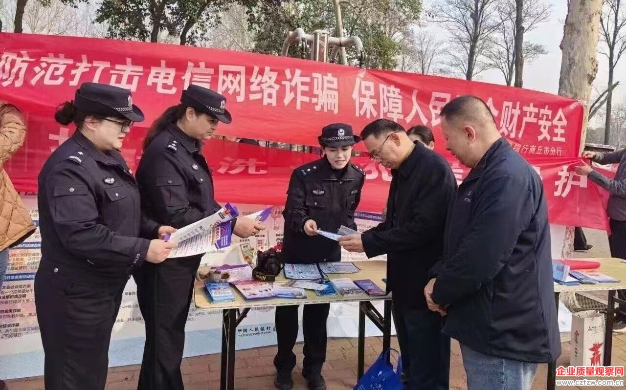 企业质量观察网.讯 记者:燕昊 通讯员: 孙军 陈大伟 高岩岩 孙共田 朱启艳 3月15日,河南省商丘市公安局睢阳分局刑事侦查大队联合人民银行商丘市分行及市区各银行机构,在金世纪广场南侧掀起一阵反诈热潮!以“315”消费者权益日为契机,把反诈知识和支付安全常识送到市民身边。