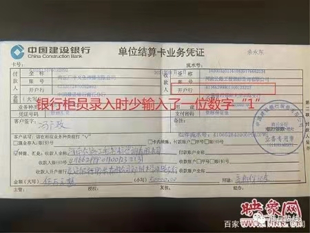1月12日,冯先生在中国建设银行商丘分行南京路分理处办理对公转账业务,为其1月13日参加竞标工程预存5万元保证金。“我填写的卡号是准确的,他们柜员在录入的时候少输入一位数字。”记者在冯先生提供的银行凭证看到原本21位的卡号,办理该业务的银行柜员余永东输入了20位数字,漏掉了一位。