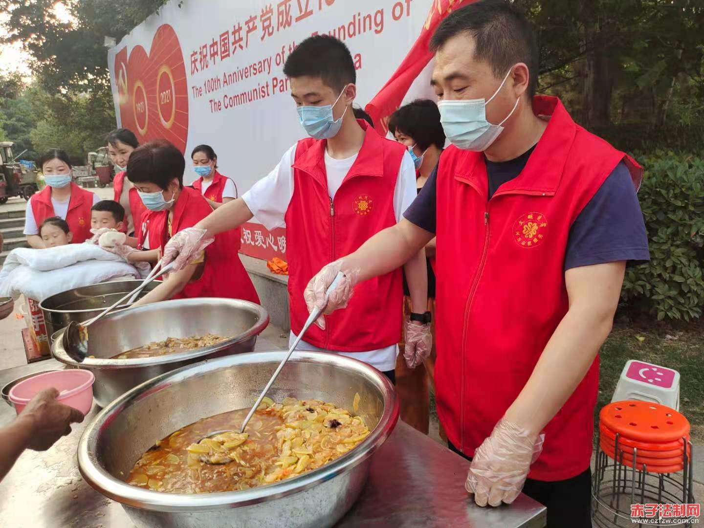 据了解,爱心晚餐于2017年6月26日开餐,志愿者达420人,运营经费全部由爱心人士、爱心团体捐赠,服务对象以环卫工人为主,以及孤寡老人、流浪人员等社会弱势群体。每天两菜一汤,鸡蛋、馒头和包子随便吃。四年来就餐达7万多人次,平均每天就餐60多人次,最多时就餐人数达107多人。当前,爱心晚餐已经成为爱心虞城的一张名片,一餐影响一座城,一餐温暖一城人。一曲《没有共产党就没有新中国》循环播放着,现场每个志愿者在不停的忙碌着......