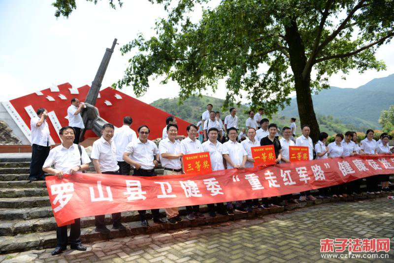 罗山县卫健委副主任科员张延波宣布罗山县卫健系统“重走红军路”健康促进健步走活动徒步大赛正式开始。随着“徒步大赛开始”的号令下达,在“我运动,我健康”等口号声中,比赛队员争先恐后,你追我赶,沿着红军路向目的地进发。比赛结束后,为获奖队员颁发了奖品。