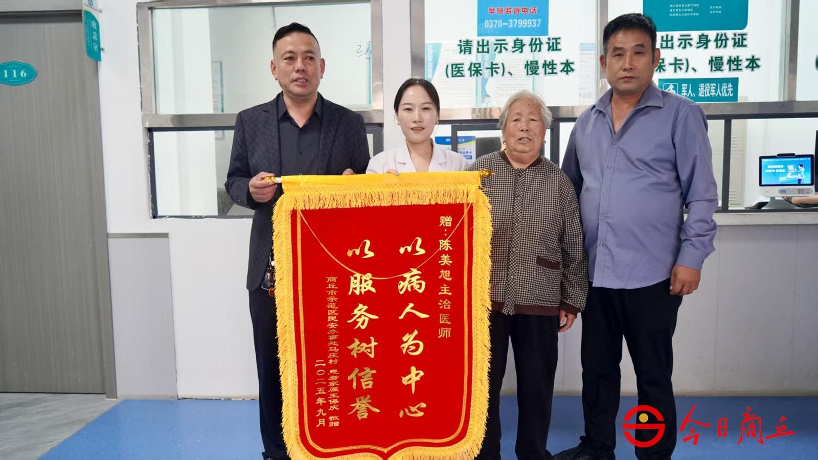 企业质量观察网.讯 记者:燕昊 通讯员:陈大伟 高岩岩 陈红 梁绘芳 朱启艳 2025年 9月28日上午,商丘市城乡一体化示范区民安社区卫生服务中心,王先生和寇先生将一面锦旗献给该中心医生陈美旭,表达内心的感激之情,感谢其对亲人的精心诊疗与殷殷关切。